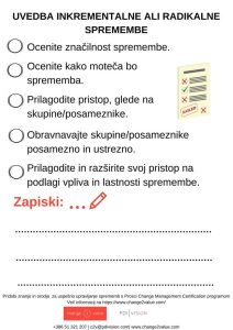 Začni projekt strukturirano! Odkljuknica upravljanja sprememb združuje seznam najbolj kritičnih opravil, ki vodijo k uspešni spremembi oziroma projektu. Vključuje kjučne točke petih planov upravljanja sprememb,